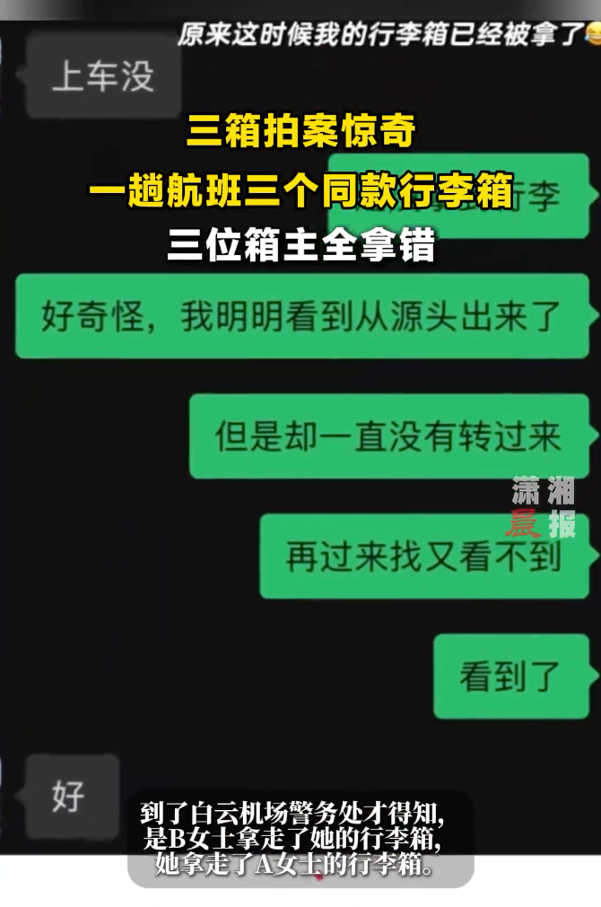 到了白云机场警务处,谢女士才得知,是B女士拿走了她的行李箱,她拿走了A女士的行李箱,A女士拿走了B女士的行李箱。