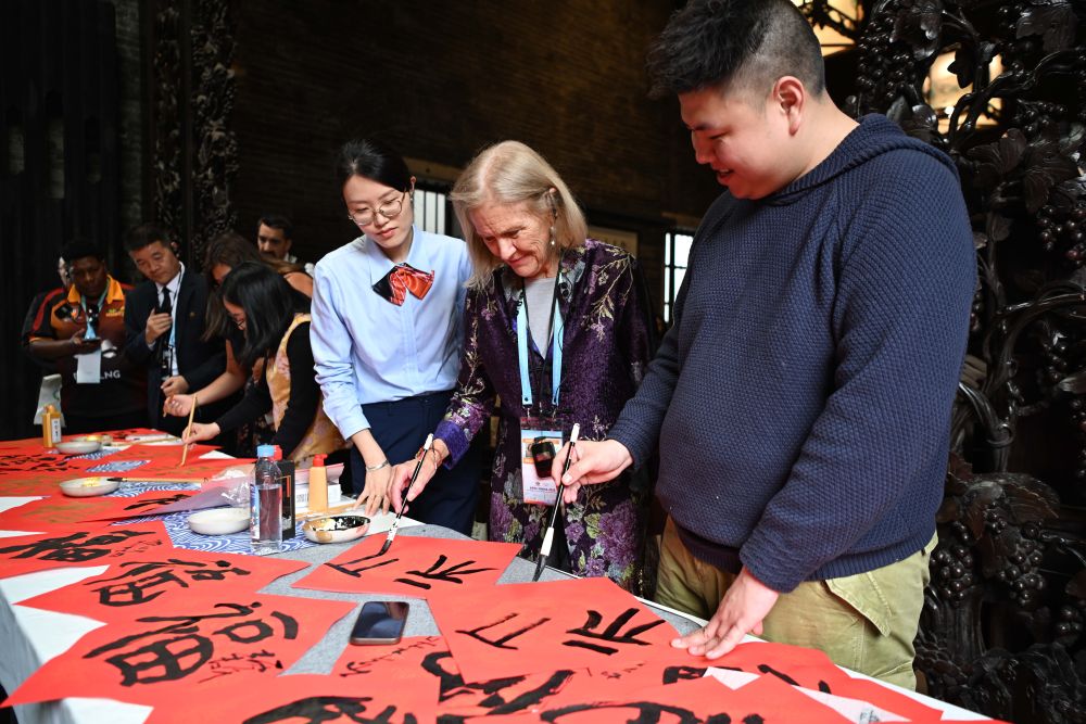 2月6日,亚太经济调解组织(APEC)2026年第一次高官会及关联会议的部分与会代表在广州陈家祠体验中国书道。 新华社记者 邓华 摄