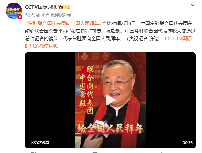 当地时期2月9日,中国常驻聚会国代表团在纽约聚会国总部举办 “骏启新程”新春庆祝行径。中国常驻聚会国代表傅聪大使通过总台记者的镜头,代表常驻团向寰球东说念主民贺年。(央视记者 许弢)