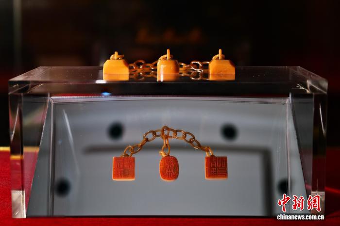 2月10日,“皇帝宸章—乾隆皇帝的宝玺”展在厦门饱读浪屿故宫文物馆开幕。图为“田黄石乾隆帝三联印”。 (饱读浪屿故宫文物馆 供图)