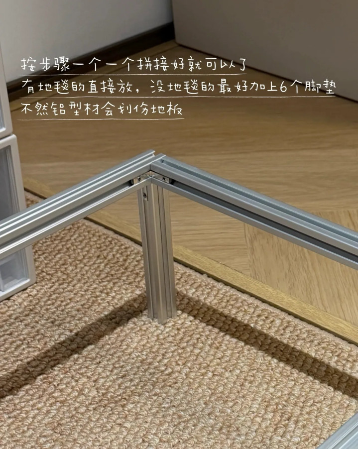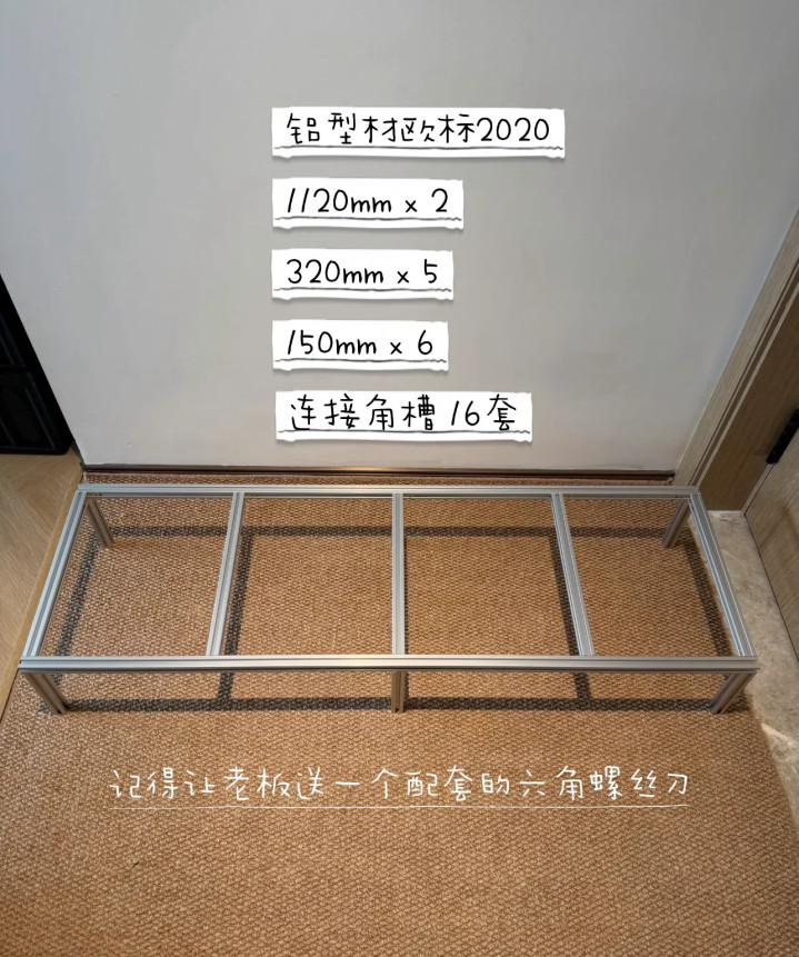 这个组合底部的增高架,是铝型材,结构很毛糙,不太懂的话,咱之前讲过的may-CAD软件,就能生成好型材规格、数目,平直给店家看,配妙品后,按图拼装就行。