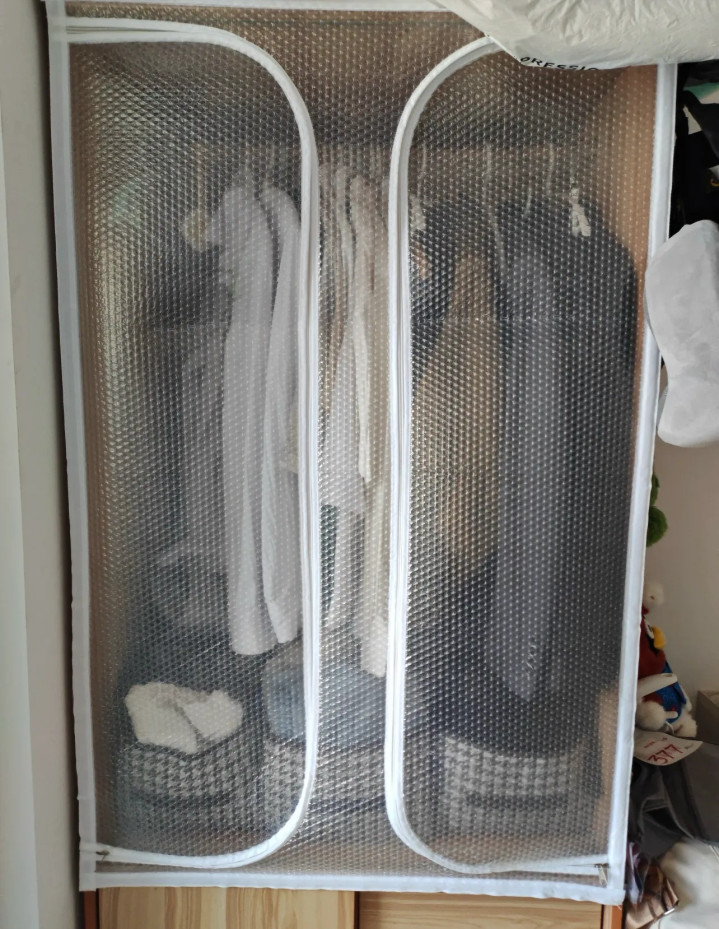 一般自带魔术贴、拉链,固定在衣柜边框上,就能酿成一个浅薄的软性柜门。