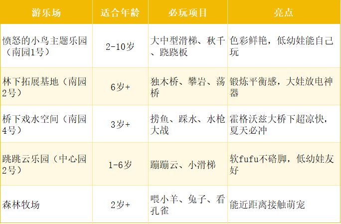 亲子配套:10处游乐场(大怒的小鸟主题/跳跳云等)、丛林牧场、蟹宝王国;