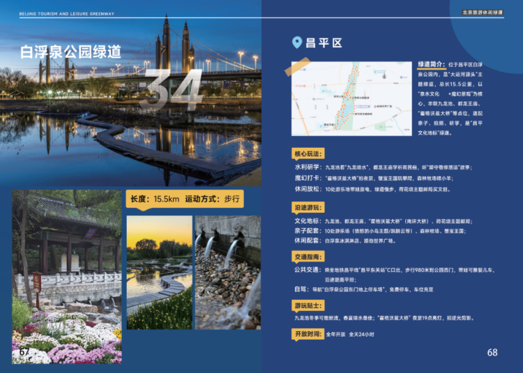 绿谈位于昌平区白浮泉公园内,是“大运河泉源”主题绿谈,总长15.5公里,以“泉水文化+玄幻景不雅”为中枢,串联白浮泉遗迹-九龙池、齐龙王庙、“霍格沃兹大桥”等点位,适配亲子、拍照、研学,是“昌平文化地标”绿谈。