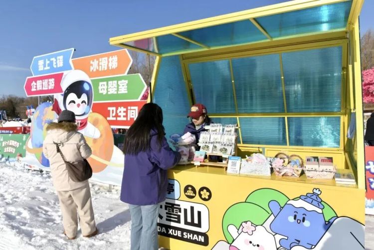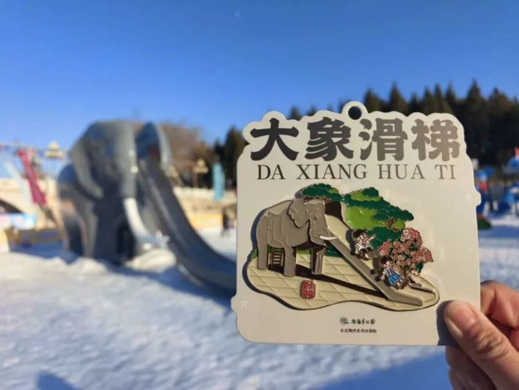 除了园内陶花圃文创店和冰雪嘉年华南门旁的文创专柜,雪场内大象滑梯北面还增设了公园自研文创家具展售点。不少搭客体验完滑梯后,齐稀奇前来选购雪柜贴。