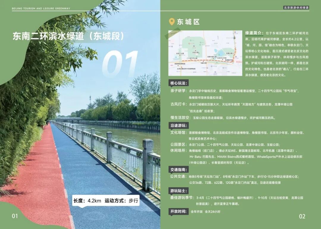 绿谈位于东城区东南二环护城河北岸,沿明代南护城河主义建设,全长约4.2公里,以 “城、河、园、馆” 深度融会为中枢特色,串联永定门、天坛等贫瘠文化地标,是千里浸式体验老北京历史文脉的滨水幽闲绿谈,适用于亲子研学、幽闲缓步及古风影相等多元场景。