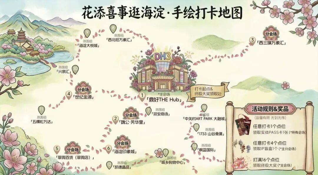 本次行径不仅有花市集花街、花车、花海等缤纷场景,更重磅推出“花添喜事逛海淀PASS卡”,带你玩转全区、打卡有礼,打卡方法一目了然。