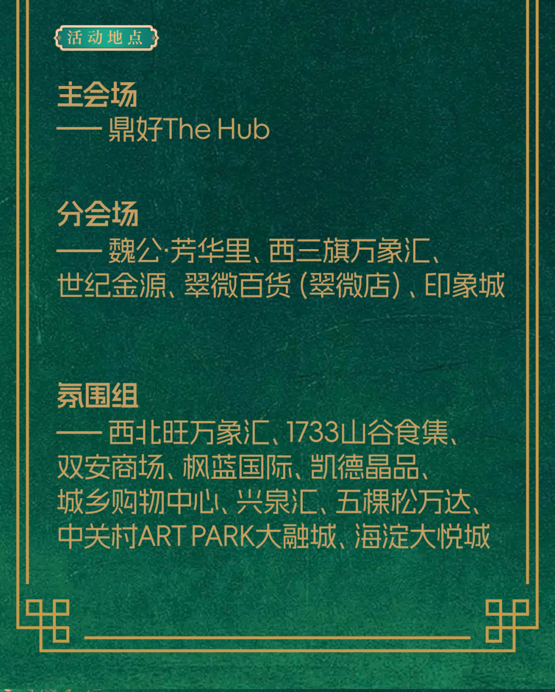 分会场:魏公·青春里、西三旗万象汇、世纪金源、翠微百货(翠微店)、印象城