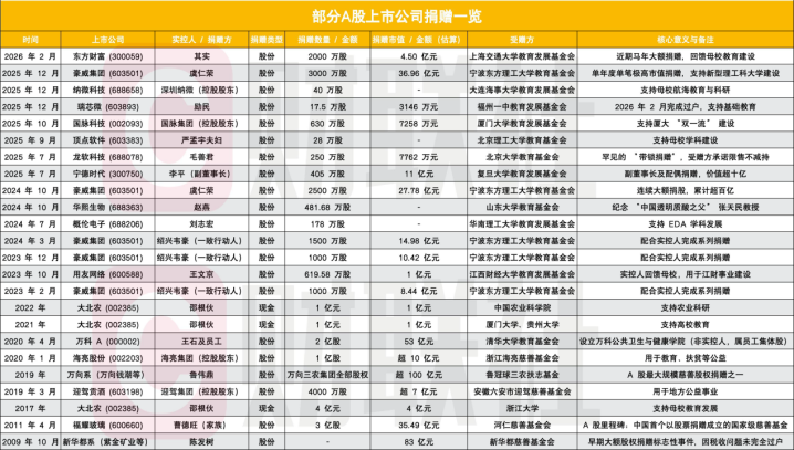 不统统统计,至少已有18家A股上市公司实控东说念主或控股推动捐赠,捐股与捐钱共计411.39亿元,2025年又是最为贴近的年份。
