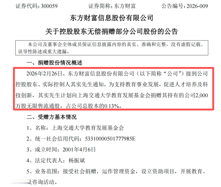 {jz:field.toptypename/}2月26日,东方钞票发布公告,接到公司控股推动、实控东说念主其实示知,为支捏西宾行状发展,促进东说念主才培养及科技转换,其实研讨朝上海交通大学西宾发展基金会捐赠其捏有的公司2000万股无穷售畅达股,占公司总股本的0.13%。该笔股权最新市值为4.5亿元。
