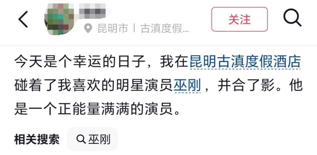 昨年的9月,有网友在昆明遭遇巫刚,认为他至极和睦,还凯旋地合了张影。
