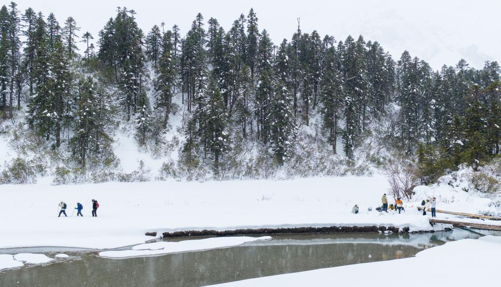 游东谈主在白普隆沟牧场感受雪景(2026年3月21日摄,无东谈主机像片)。新华社记者 普布次仁 摄