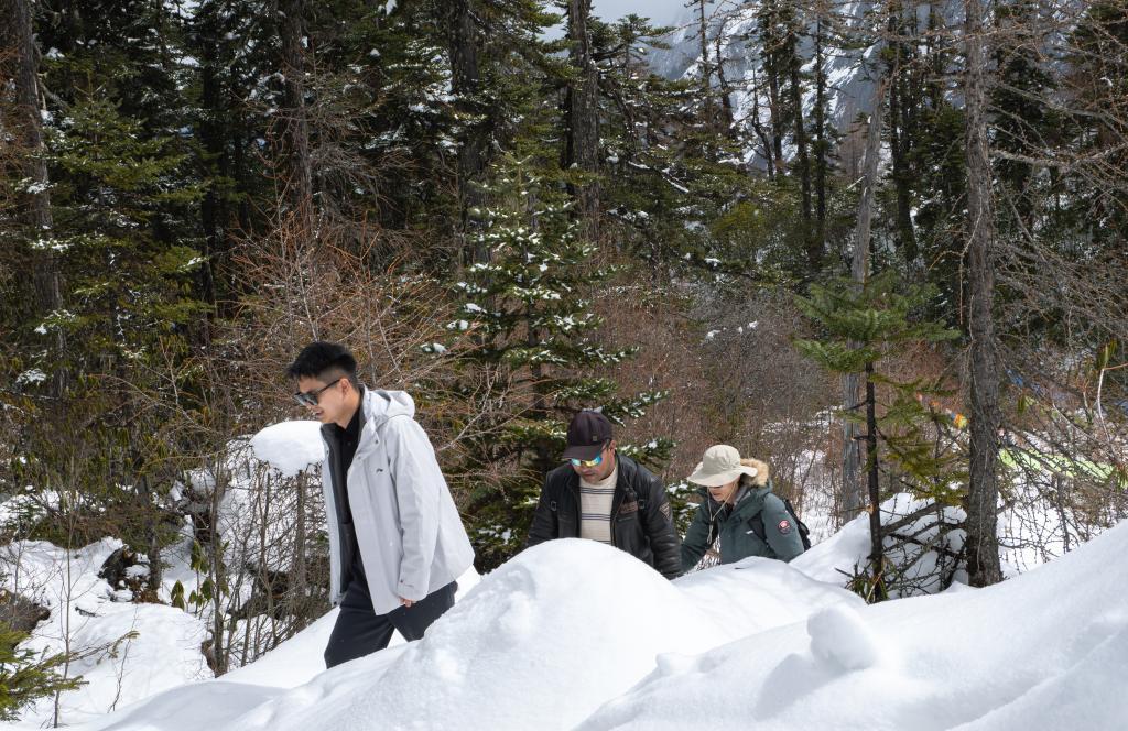 2026年3月21日,游东谈主和当地向导徒步投入白普隆沟牧场。新华社记者 洛卓嘉措 摄