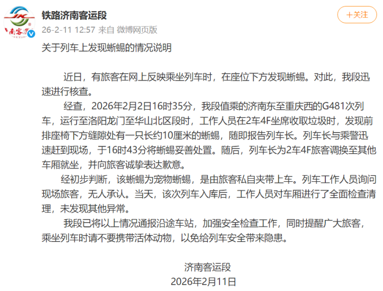 经查,2026年2月2日16时35分,我段值乘的济南东至重庆西的G481次列车,启动至洛阳龙门至华山北区段时,使命主说念主员在2车4F坐席收取垃圾时,发现前排座椅下方弊端处有一只长约10厘米的蜥蜴,立时报告列车长。列车长与乘警赶快赶到现场,于16时43分将蜥蜴妥善处理。随后,一分彩列车长为2车4F搭客调理至其他车厢就坐,并向搭客诚笃抒发歉意。