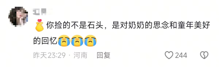 视频发布后,激勉了大批网友对亲情的共识。有网友留言:“不是对石头有厚谊,而是因为这块石头猜测了我方的亲东说念主”“石头本莫得厚谊,是心里顾虑的阿谁东说念主赋予了它兴味”“句句不说想念,句句齐是想念”“于是咱们集结了什么叫‘熟习的一砖一瓦、一针一线’”。看了这样多批驳,解皓明也深有叹惜:“从批驳区不错看出,民众齐在回忆与梓里、与亲东说念主的一丝一滴。每个东说念主心中齐有不同样的‘压锅石’吧。”