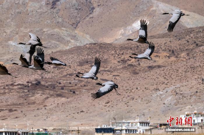 2月8日,一群越冬黑颈鹤飞过拉萨市林周县春堆乡卡东村上空。中新社记者 江飞波 摄