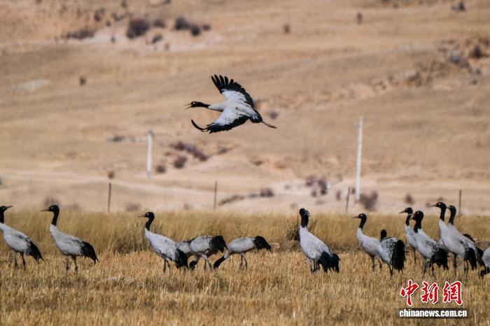 2月8日,在西藏林周县春堆乡卡东村周边越冬的黑颈鹤群。 中新社记者 江飞波 摄