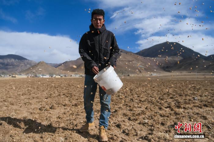2月8日,kaiyun sports西藏拉萨林周县黑颈鹤巡护员桑珠在田间播种小麦,为黑颈鹤补充食品。中新社记者 江飞波 摄