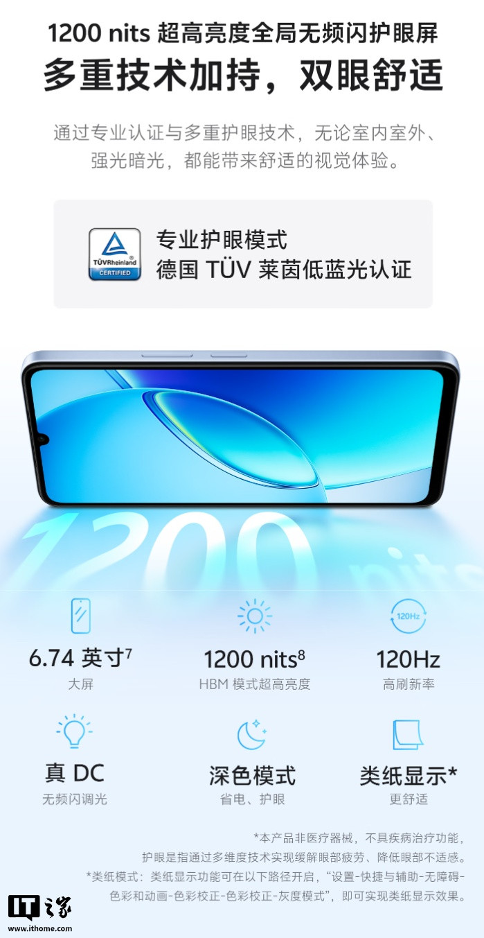 同期,这款手机还相沿IP65防尘抗水、TUV莱茵低蓝光认证,具备红外遥控功能,出厂预装OriginOS6操作系统。