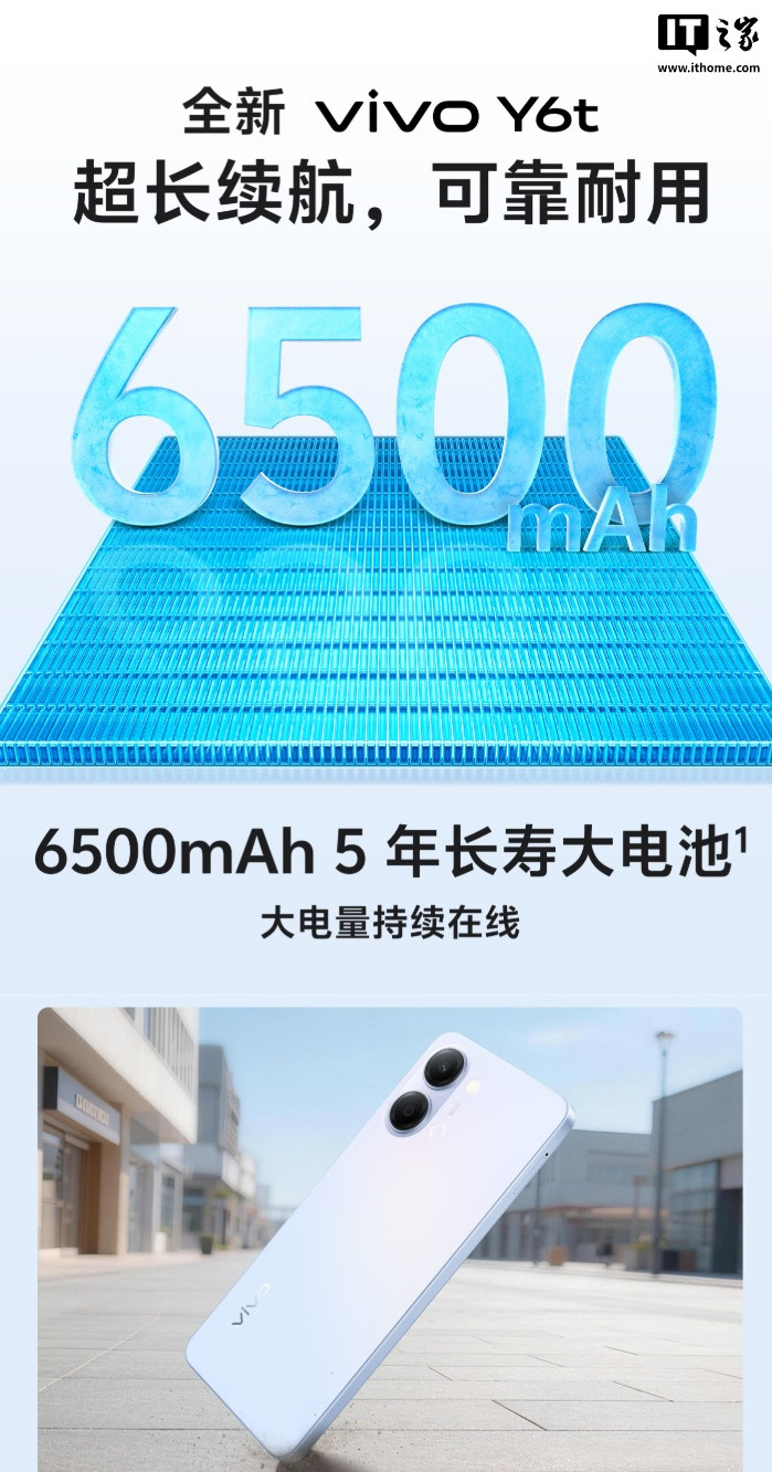 IT之家4月20日讯息,vivoY6t手机现已开启预售,新机主打6500mAh大电板蓄意,搭载骁龙4Gen2(第二代骁龙4)移动平台,售价1299元起。